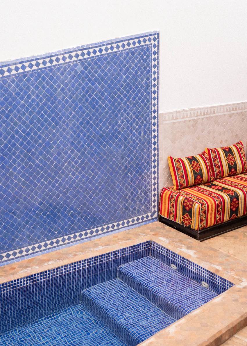 Les coussins brodés, les moucharabiehs ciselés, le doux clapotis du bassin en toile de fond… Le salon marocain extérieur de Riad Safia est une invitation à la douceur, au partage et à la contemplation, dans un décor d'une authenticité rare.