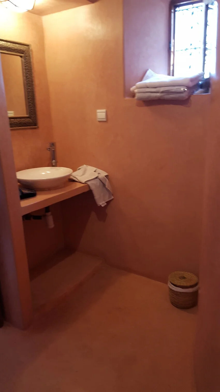 La jarre en cuivre, gardienne de l'eau depuis des siècles, trône fièrement dans cette salle de bain. Ici, la douche devient cérémonie, et chaque geste un hommage à la tradition du hammam marocain