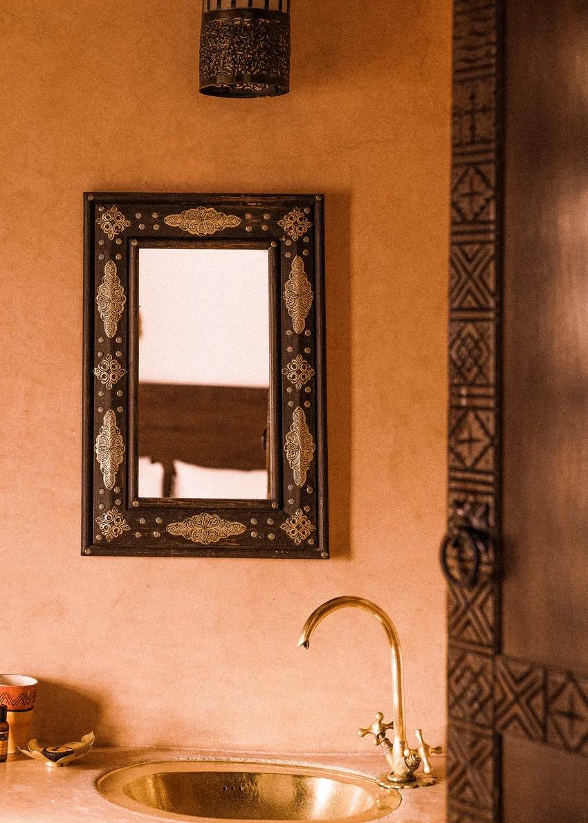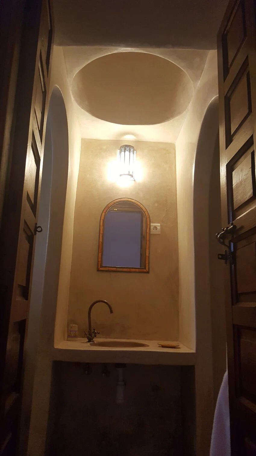 Derrière cette porte, l'art oriental règne en maître. Les zelliges aux motifs marrakchis, les ornements ciselés et l'atmosphère envoûtante de la salle de bain d'Izza transforment chaque moment en une parenthèse de sérénité et de raffinement absolu.