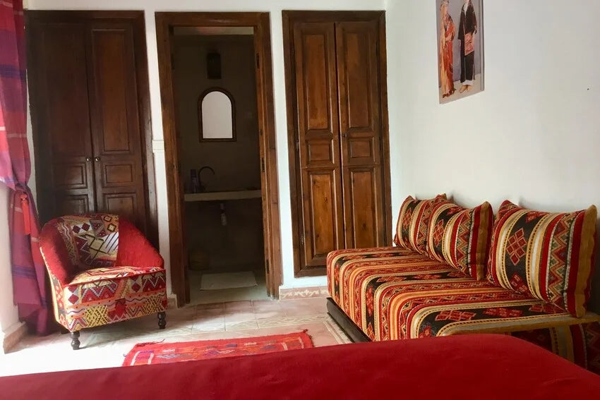 Dans la Suite Nina, les teintes chaudes du rouge et du marron vous enveloppent comme un coucher de soleil sur la médina. Lit double somptueux, fauteuil élégant, petite table finement ouvragée… un décor typiquement marocain qui célèbre l'art de vivre à la marrakchie.